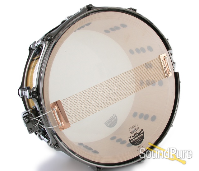 This limited drum is the top of the line of the SONOR snare program and honors the long tradition of exiting veneers and innovative instruments within the company's history. It is part of a series that features an extremely limited run of 45 special designed snare drums with spectacular natural grown veneers and new shell designs. At the time this one was ordered, there were only 8 in the United States. At the heart of theis drum is a 21 ply maple shell that measures in at a hefty 14.65mm thick which provides an added focus at lower volume playing and encuated attack at higher velocities. 2.3mm triple flanged hoops on top and bottom leave some openess to help offset the thicker shell without sacrificing definition. The bottom hoop has an open bridge design to fully benefit the Dual Glide System. The Dual Glide strainer mechanism features a technically perfected snare wire engage-and-release system, along with great adjustability and a solid look and feel. The snare features a gorgeous high gloss lacquered White Ebony veneer that is complemented with a One of a Kind badge with laser cut mallet shaped logo in a matching White Ebony veneer. Rounding out the package, black nickel plated hardware and 18-strand bronze wires, handmade in Germany.