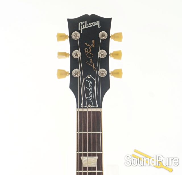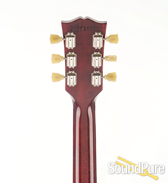 Non-weight-relieved mahogany body with carved maple cap, mahogany neck with 50s Vintage profile, Indian rosewood fretboard with trapezoid inlays and 22 medium jumbo frets, Burstbucker 1 and Burstbucker 2 pickups with Alnico 2 magnets, Gibson hardshell case