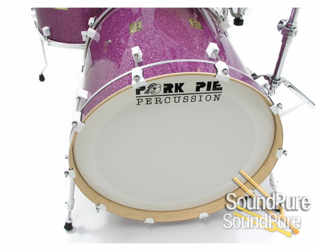 Superb Style, and thunerous tone from this maple shell drumset from Pork Pie! Purple Glass Glitter with gloss white powdercoated hardware. Drum sizes are 9x12, 14x16, 20x22, 7x14.