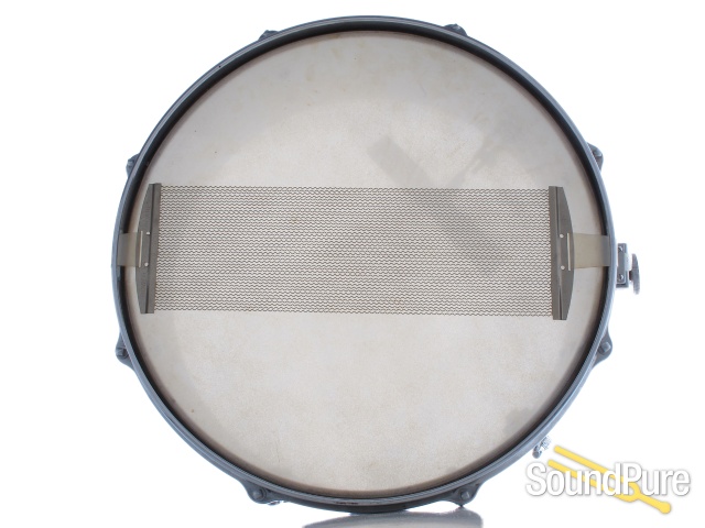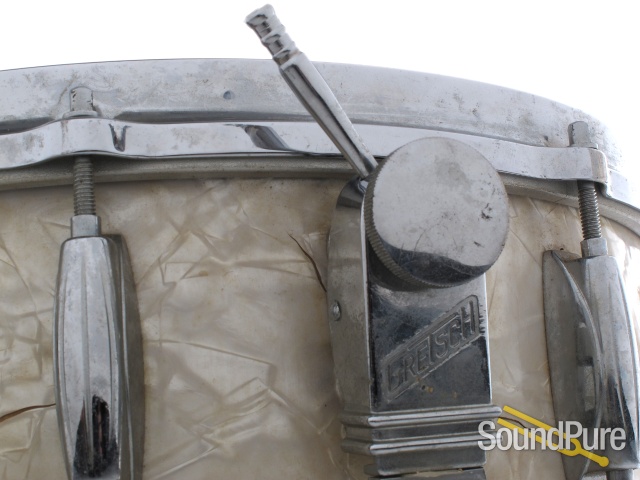 Everything appears to be original hardware, heads, snare wires and wrapping. Sonically this drum is incredible. Pronounced and powerful after many years being gently used. Cosmetically there are some cracks in the outer wrapping and the wrapping is lifting at the seam of the wrapping but these do not impact the sound! The hardware is in good shape with some light pitting and light surface scratches on the lugs and hoops. The hoops are the originals and create a commanding rimshot! This Gretsch includes a snap-in drum key and other than that and the badge vent there are no extra holes. While the sound is complete the looks could use some attention from a Gretsch lover who might want to do a little refurbishing work. At the end of the day, this drum will put a modern snare on its heels and for half the price!