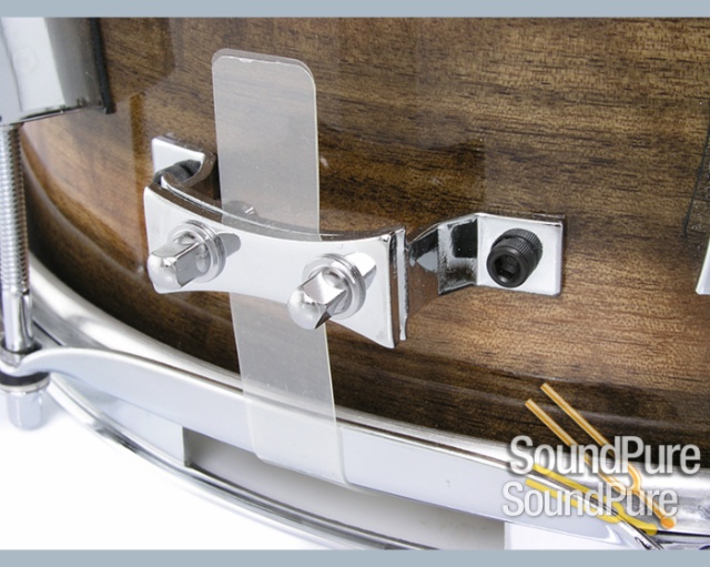 The tone of the walnut shell is very balanced, and simply wonderful. It’s a little lower in pitch than a similarly sized maple, but just so smooth and organic. Rim shots are wonderfully tight and cutting. I was surprised to find this snare has very minimal overtones, even with a single ply head.
