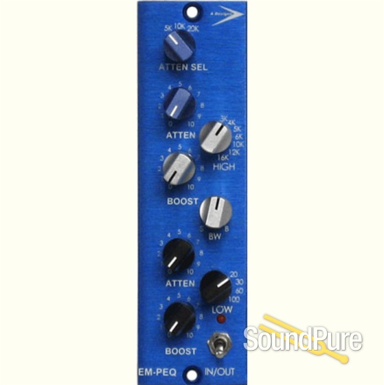 Additional features of the EM-PEQ include a nickel-core output transformer, gold Grayhill rotary switches, Wima caps, and a true hard-wired bypass. Plus, instead of using common off-the-shelf chokes, A-Designs uses a custom tapped inductor, wound to the original values as the original Pultec. Along with the classic EQ circuitry, layout, and exceptionally musical sound of the classic Pultec, the EM-PEQ offers fully balanced, noise-free performance and modern impedance specs for easy operation and fast studio integration.