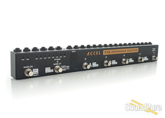 Accel's FX8 Command Center is one of the most compact and intuitive programmable 8 Loop switchers on the market. Featuring 4 presets per bank, 20 banks total with the ability to program up to 80 presets. Also the ability to set up active banks so you can narrow the range of banks set to your specific requirements, minimizing the need to unnecessarily bank up or down. Out of the 20 banks available, we have split these into two groups of 10 for those who play in more than one band, play different genre's of music or who simply would like to clearly define two different setups. This will further simplify your effects switching on stage or at rehearsal. With 8 Effects pedal loops, you can run 7 loops in front of your amp and 1 in the amps effects loop or all 8 in front of your amp . The FX8 Command Center also has 2 dedicated foot switches to get the most out of your amp switching capabilities (The amp switching function applies to amps with normally open or normally closed switch designs, not proprietary switch designs). Also Tuner/Mute Function, Bank Up and Bank Down Foot Switches, Factory Reset & Easy Bypass functionality.