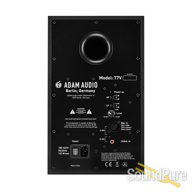 The T7V features a 7” woofer that provides bass extension down to 39 Hz, while the U-ART tweeter’s diaphragm provides pristine and extended high-frequency response up to 25 kHz – virtually unheard of in monitors in this price range. The U-ART tweeter is fitted to a precision waveguide with the same dispersion-control attributes as the High Frequency Propagation (HPS) waveguideused in ADAM Audio’s flagship S Series studio monitors. The waveguide’s highly uniform dispersion of high frequencies provides an incredibly wide sweet spot that frees you from being glued to a rigid mix position while working.
