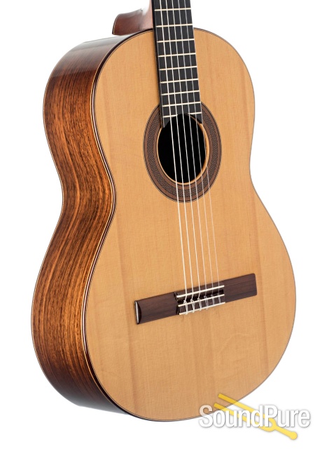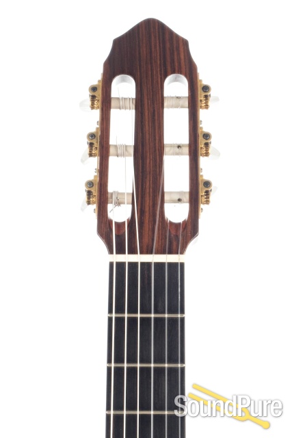 Blooming bass, direct mids and silky-smoth treble response, created by the combo of spruce top with bookmatched East Indian rosewood, set this nylon-string beauty apart. The mahogany neck is a shallow-D profile and fits right in the hand. A gorgeous vintage player's guitar.