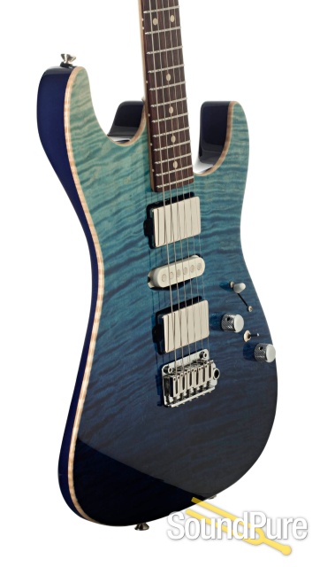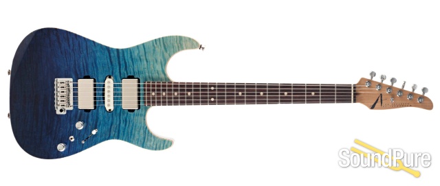 Catch a few (sound) waves with this Wipeout Blue Drop-Top from Tom Anderson! Just as the finish transitions from sunlight surf to pelagic blue, this guitar gives you high-end sparkle, midrange punch, and low-end girth thanks to the HSH pickup configuration on basswood body. The HC1 neck pickup is sweet and clear, while the HC3 bridge pickup gives you hot output with a vintage flavor. Nestled between these is an SC2 hum-canceling single coil for hot and spanky tones. This overall setup gives you a sound that’s perfect for high-gain shredding as well as clean picking. And what better to give you ease of play than a Rosewood board on a Caramel Maple neck? Cowabunga!