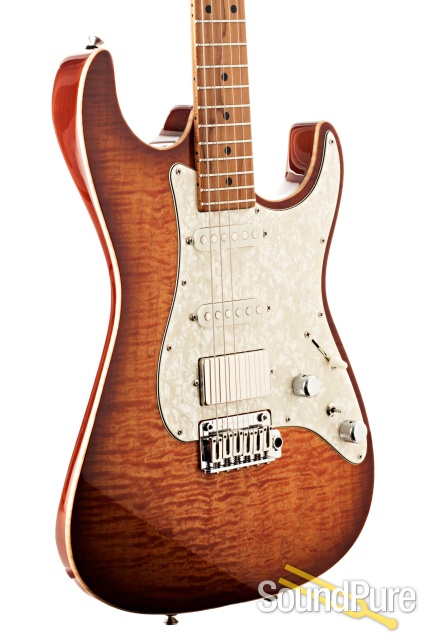Drop Top Classic announces itself with a radiant book-matched flame or quilted maple, koa or walnut top that is actually bent (or "dropped") over a carefully chosen tone wood body create a smooth and comfortable, swooping forearm contour, and it does it all in keeping with the traditional of pickguard styling.