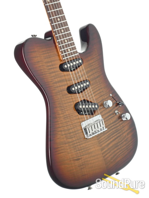 Decked out in beautiful roasted Flame Maple, this Hollow Top T has plenty of extra snap in the attack and air in the tone that sets it apart from the pack. Tom's SC1 give up glittering clean tones in the neck and middle positions, while the TF3 in the bridge brings back massive, nearly Les Paul thicknes!