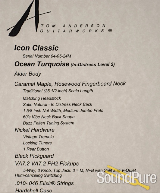 The Anderson Icon Classic In-Distress is a beautifully aged, effortlessly inspiring guitar that feels like an old favorite from the first note. Its alder body rings with balanced resonance, finished in striking Ocean Turquoise with tasteful Level 2 checking and rub-through for authentic vintage charm. The caramel maple neck with rosewood fingerboard and “60’s Vibe” profile plays smooth and familiar, while the VA7.2 and PH2 pickups deliver everything from sparkling, quiet single-coil tones to fuller punch with split versatility. With a vintage trem and thoughtful modern switching, this Icon Classic is a confident, professional-grade investment—built to perform flawlessly and look cooler every year.