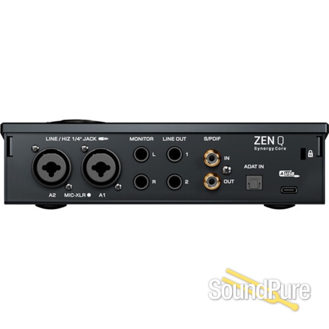 Zen Q features 2 Combo XLR jacks with switchable modes to toggle between the Discrete console-grade preamps, line level, or Hi-Z. The front panel includes 2 switchable LINE/HI-Z inputs for added flexibility. For monitoring, you have a stereo monitor output and a separate line output pair to connect another set of studio monitors or external outboard gear. While both are backed by a mastering-grade D/A converter, there is a separate DAC for the pair of independent headphone outputs. If expansion is required, a simple desktop setup can easily transform into a multichannel configuration via digital SPDIF I/O or ADAT IN.