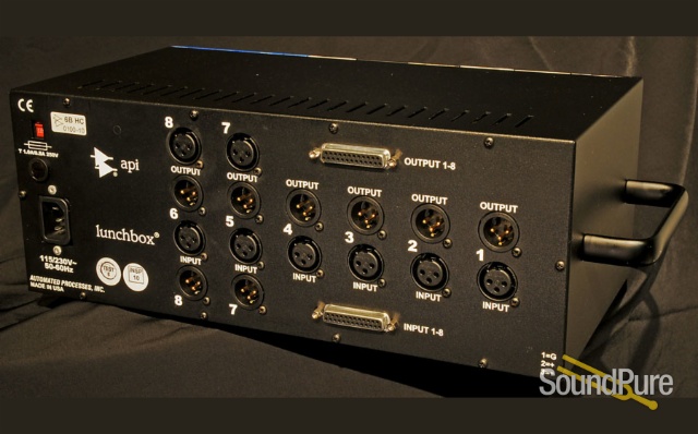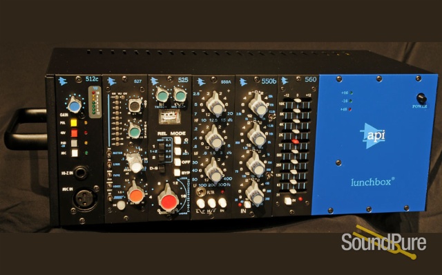 The API 500-6B lunchbox is a 6-slot rack designed to accept all API standard 5.25" X 1.5" modules. This quality allows an engineer the flexibility to bring along specialized EQ effects to any situation: 550A, 550b or 560. The lunchbox is self-powered with a rear panel selected AC voltage switch and a removable power cord. The input/output jacks are XLR. The lunchbox comes standard with a +48 volt internal phantom power supply, bussed to pin 15 for interface with the API 512c Mic Preamplifier. API makes several modules for the 500-6B, including the 512c Mic Preamplifier, the 525 Compressor, the 527 Compressor, the 550A 3-band EQ, the 550b 4-band EQ and the 560 Graphic EQ. Combinations of these modules make perfect stereo recording packages (two 512cs and two 550bs) or vocalist's box (one 512c, two EQs and one 527). Other uses for the versatile lunchbox include:
