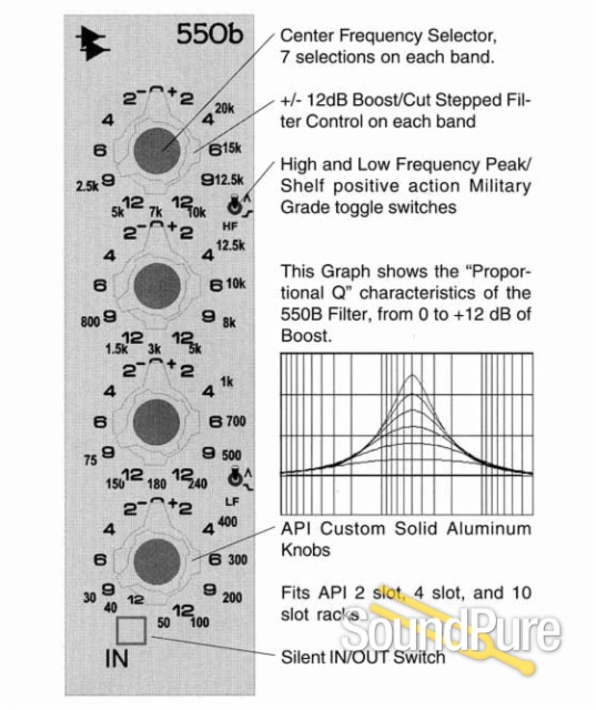 Making use of API's "Proportional Q," an innovation designed by Saul Walker in the '60s, the 550b intuitively widens the filter bandwidth at minimal settings and narrows it at higher settings without the need for additional bandwidth controls. This unique feature minimizes the "phase-shift" sound found in many equalizers. In addition, the reciprocal nature of the 550b enables the user to "undo" what has been done previously with exact precision.