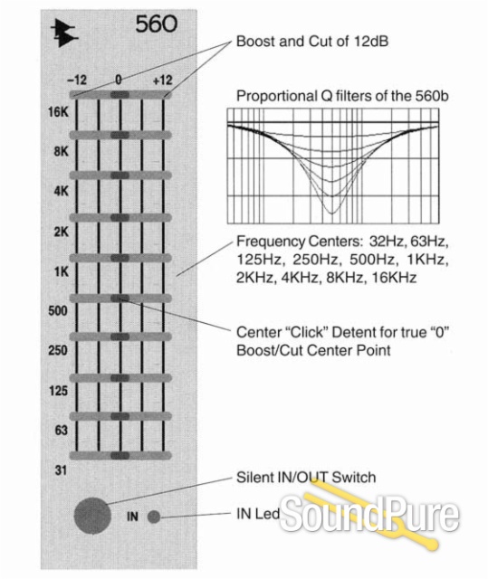 The 10 precision EQ bands make the 560 ideal for signal sweetening and room tuning. A great companion to a parametric EQ, the 560 utilizes API's unique "Proportional Q" design introduced during the '60s. This design intuitively widens the filter bandwidth at lower boost/cut levels and narrows it at higher settings. Additionally, boost and cut characteristics are identical, allowing previous actions to be undone if desired.
