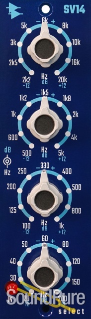The API Select SV14 EQ circuit design is likewise rooted in API’s history. Faithfully re-engineered from the highly sought-after APSI 562 EQ's which were distributed by API during the1970’s and 1980’s, the SV14 provides parametric equalization at an affordable price point. The SV14 alsofeatures an EQ in/out switch, transformer balanced output, and dual concentric knobs which providecontinuously variable control of boost/cut and frequency selection.