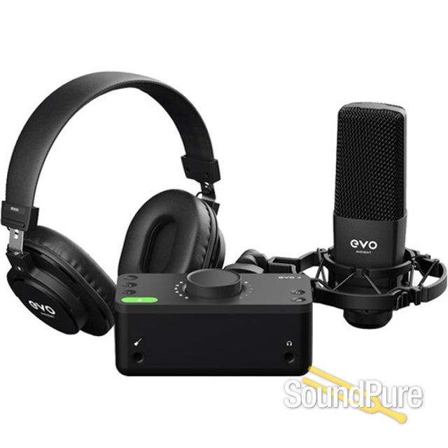 A complete home recording package that makes capturing high-quality audio effortless for podcasters, musicians, producers, and content creators, the Audient EVO Start Recording Bundle includes the EVO 4 desktop 2x2 USB Type-C audio interface, the EVO SR1 supercardioid condenser microphone, the EVO SR2000 monitoring headphones, a shockmount for the mic, and an XLR mic cable.
