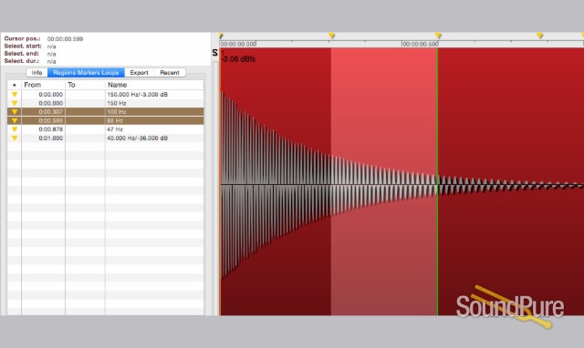 In the above examples we stayed in the digital domain, since it is far less complicated than performing similar tests in the analogue domain. It does not suffice to simply listen to a sweep played back in a room if you want to draw sound conclusions about the acoustic characteristics of that room. You"ll be measuring a lot of things at the same time: playback system -> amplification -> speakers -> room -> ear. The peaks and dips that you notice can be in either of these filters in the chain. In general you want to isolate an element from the chain to find its characteristics. This can be done, for instance, by knowing the frequency responses of all other elements, and taking them into account when observing the results. Some professional equipment is supplied with a frequency response measurement chart, enabling you to do just this. In lab situations anechoic rooms are used for the same reasons: excluding, in this case, the room itself from the complete measured chain. Using an accurate level meter (in your mixing desk) at various stages in the chain can help too. While playing back the sweep, the meters follow the frequency response of the element you are measuring. Try your own room with a Full Bandwidth sweep to observe how flat the complete chain is. Often you will hear very distinct peaks and dips. If you want to "zoom in" on the suspect area, use the "Custom Sweep" method to narrow down the frequency parameters, while remaining the length. Recording the sweeps back into your hard disk recorder allow you to view the envelopes (the frequency response) of the results.