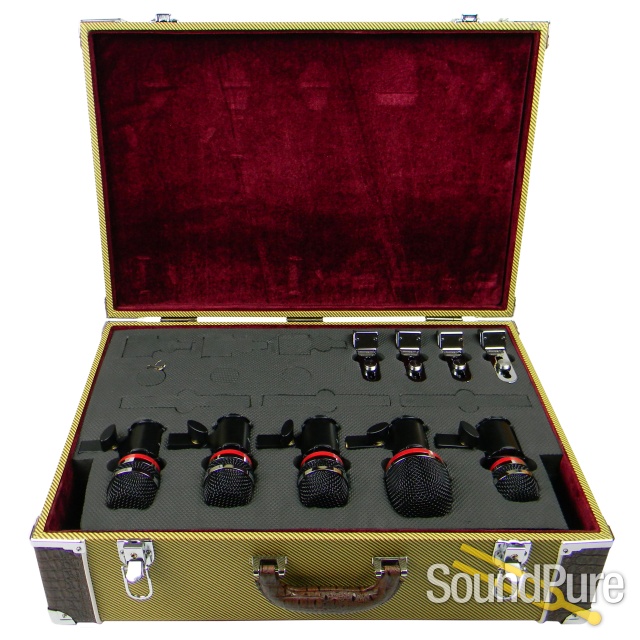The custom vintage tweed case is hand-built for heavy-duty storage (and groovy-looking, to boot!). The metal corners, locking latches, high-density foam tray, and plush lining make this case very roadworthy while offering a visually unique design. Aesthetically, the case features a tweed and faux-alligator trim exterior, with a Cabernet wine-red plush lining. The slotted foam tray not only protects and stores each component of the drum mic kit, but also lifts out of the case to provide storage for cables, sticks, etc. Additionally, by removing the tray you are left with a fantastic and stylish piece of carry-on luggage.