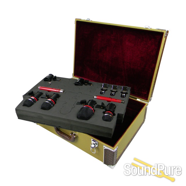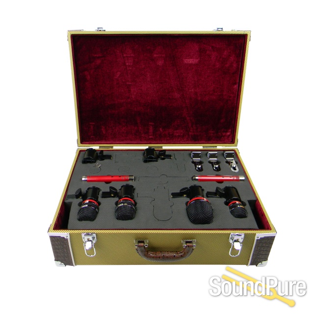 The custom vintage tweed case is hand-built for heavy-duty storage (and groovy-looking, to boot!). The metal corners, locking latches, high-density foam tray, and plush lining make this case very roadworthy while offering a visually unique design. Aesthetically, the case features a tweed and faux-alligator trim exterior, with a Cabernet wine-red plush lining. The slotted foam tray not only protects and stores each component of the drum mic kit, but also lifts out of the case to provide storage for cables, sticks, etc. Additionally, by removing the tray you are left with a fantastic and stylish piece of carry-on luggage.