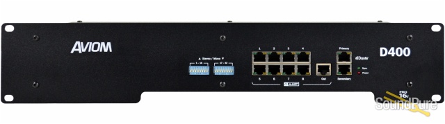 There are two versions of the D400 product. The standard D400 has an Aviom A-Net input, perfect for using with Aviom's analog input modules or digital console cards from Aviom or our third party partners. The D400-Dante has a Dante input instead, and allows up to 32 channels (at 44.1/48kHz) to be routed from a Dante-enabled console or digital audio network to the Personal Mixers.