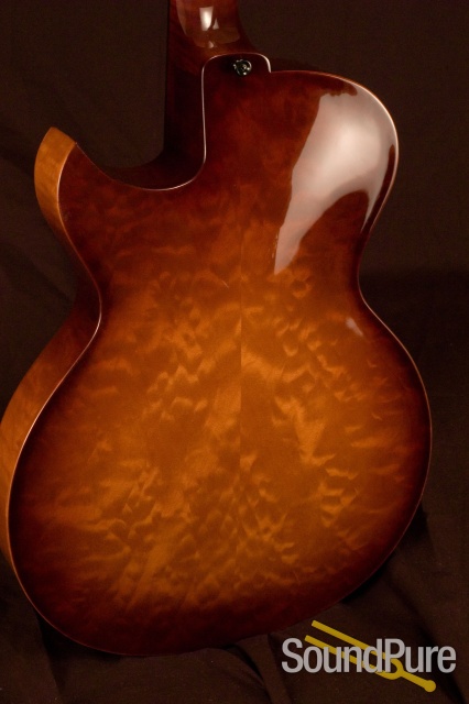 This captivating guitar has a master grade, hand carved spruce top and features a quilted maple hand carved back with matching sides. At 14 1/2" wide and 2 1/4" deep, the Bambino Elite is small in stature but huge in tonality and flexibility. This particular guitar is a one-off antique burst finish (slightly darker than the violin burst normally used on this model). More pictures available by request.