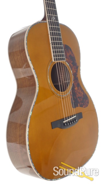 Just when we thought they couldn't get any cleaner, any more sophisticated, this little number shows up on our doorstep from Boucher. Ultimate indeed! The downright regal appointments on this instrument, from binding to toner to tuners, couldn't be a more fitting chorus to herald the Master Grade Adirondack top and Highly Flamed Walnut back/sides. The trademark balance and richness of Robin's OOOs is here in spades but the authoritative bass, full, compressed mids and delicate, clear-but-not-piercing highs caught us by surprise. Stunning!