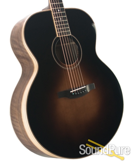 A sonic giant with a heart of gold! This masterful S-Jumbo from Robin Boucher is as sweet and nuanced as it is brawny and boomy. While that superlative flamed Walnut on the back and sides (the likes of which we've never seen and will likely never see again) provides a great fundamental-based tonality, it still works well with the Adirondack to provide plenty of shimmer and nuance in the mid and upper ranges, as well a clean, controlled quality to the unmatched bass presence afforded by this titanic body style. The refined overtone content and natural sustain blanket the dynamic range with a unique sweetness--similar to the wonderfully gentle sunburst on that Master Grade Bearclaw Addy top. I found that plenty of nuance and power is available to bare-finger players, but this massive charmer really hits its stride with either flat or fingerpicks involved--fans of everything from Rev. Gary Davis arrangements to more obscure open-tuning stylings are in for a guaranteed thrill from the first fretting with this one. Call us up today to find out more--we're happy to help you make room in your life for this one-of-a-kind giant!