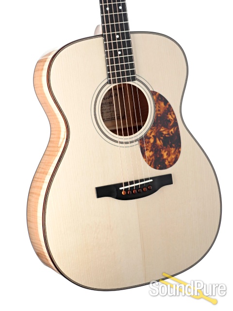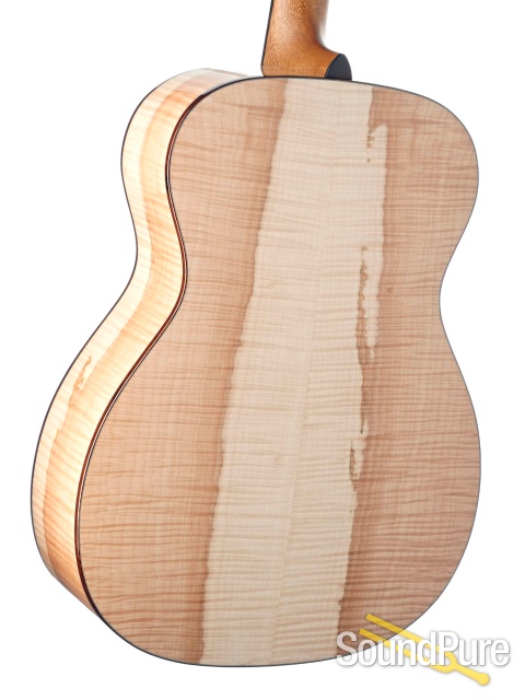 Everything you love about maple and nothing you don't. This private-stock offering from Boucher features a gleaming AAAA Adirondack spruce top complemented by stunning maple back and sides, flaunting prominent flame all around and dramatic sapwood figuring on the two-piece back. The combo of Addy and maple produces a bright yet even frequency response: tight low end, warm mids and pleasant treble. It's an expressive fingerpicker and very well-balanced as a strummer. A stunning guitar that sounds as good as it looks.