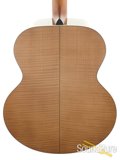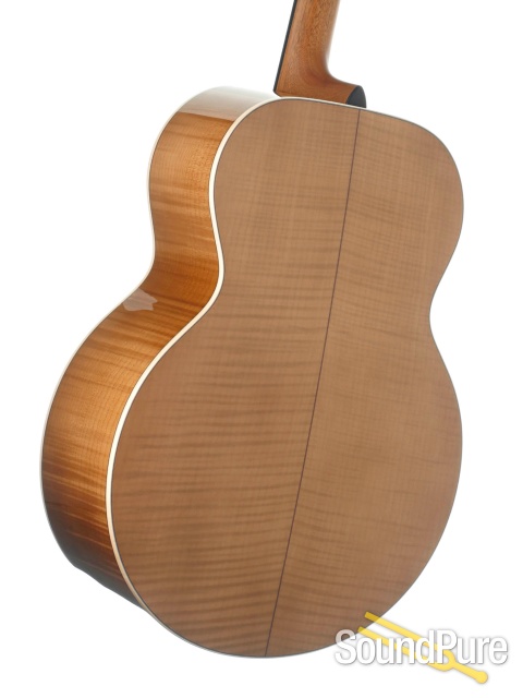 Speaking as someone who is rather picky about his acoustics, this thing has me swooning. This guitar really has a unique voice - the bass frequencies are there but they're surrounded by a crispness (in part thanks to the eye-catching flamed maple) without the sound being like an icepick to the ears. The guitar practically plays itself too, again thanks in part to the carve of the neck - it feels like a wide eliptical in the hand but it isn't overly beefy.