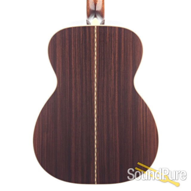 This is what Bourgeois is all about! A classic look straight from Martin's golden era (I mean, really, look at those pictures) and a sound that only Dana's present day wizardry could produce. It's incredible how close that beautifully cured East Indian sounds to its more costly Brazilian and Madagascan cousins. Dark, deep lows, a pleasant scoop to the mids to balance out the bodystyle's natural mid-heavy nature, and highs that ring out full and pure. This guitar also happens to be a self-proving argument for the torrefaction process, Bourgeois' in particular. The punch, resonance, and richness that practically explodes out of this guitar are what you'd expect from an instrument that's been around for decades.