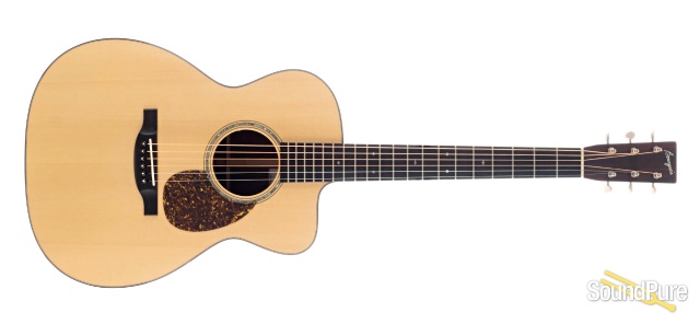 "Many years ago, Eric Schoenberg dreamed about having an OM with a cutaway styled after the Selmer Maccaferri guitar. I drew up something that he liked and started building, but found that I wasn't able, at the time, to make such a tight bend in the side! So I gave up and substituted the much rounder version that I still use today." The OM is already a small guitar. It's unique sound results from the ratio between it's 25.5" scale length, the surface area of its soundboard, and the volume of it's air cavity. The addition of a cutaway, therefore, is no small consideration. Harmonizing beautifully with the classic curves of the original OM outline, Dana's solution offers three additional frets of accessibility while minimally altering the OM's critical proportions. The standard OMC with a European spruce top is a fingerpicker's dream. (Sitka and Adirondack spruce tops are also offered as popular options.) The OMC is simply and elegantly appointed with East Indian Rosewood back and sides, a wood rosette, Short patterned Squares and diamonds inlay, Ebony pyramid bridge, tortoiseshell binding and gold Waverly tuners. Sean Watkins, of Nickel Creek, used his Bourgeois OMC to record most of the cuts on his CD, Let It Fall. The solo guitar piece, "Cloudbreak", is an excellent example of what the OMC is all about. An audio clip of "Cloudbreak" can be found on the Let It Fall page of the website, www.sugarhillrecords.com. Check it out! Except as noted, all Bourgeois models include the following features: 25.5" Scale Length, One piece Mahogany Neck, Bone Nut & Saddle, Ebony Fretboard & Bridge, High Gloss Body and Satin Neck Finish, Mother of Pearl Bourgeois headstock inlay, Bourgeois Premium Tortoiseshell style pickguard, Ivoroid Bridge and Ed Pins, Deluxe Hardshell Case and a Limited Lifetime Warranty. A variety of optional tonewoods, appointments, hardware and finishes are also available.