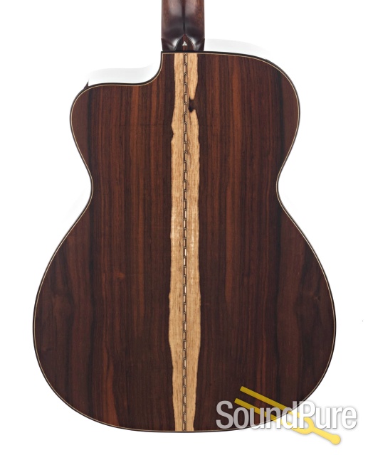 Dana Bourgeois says: “Many years ago, inspired by Eric Schoenberg, I built what I believe was the first OM having a style of cutaway that has since become something of a modern classic. Eric and I later founded a company to produce the new model, which we named "The Soloist", after an elegant fingerstyle guitar from the Victorian era. The Bourgeois Soloist is a true fingerstyle OM, featuring a European spruce top, Brazilian rosewood back and sides, a 2 5/16" ebony pyramid bridge, and the original Soloist style cutaway. Maintaining the spirit of the original Soloist, I combined the finest woods with the simplest of appointments, including Ziricote body bindings, simple wooden rosette, short pattern slotted squares and diamonds inlay, and a distinctive slotted triangle on the heel cap. While on the subject of decoration, I should note that the marquetry backstrip that I first designed for the Soloist (and now use on many of my guitars) has been as widely emulated, and is presently available through a number of lutherie suppliers. Far from being offended, I am delighted by the notion that other luthiers have mistaken this for vintage design!"