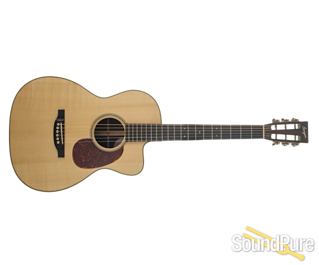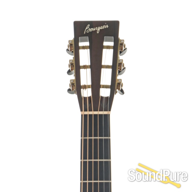 A Bourgeois Orchestra Model with GERMAN SPRUCE and Rosewood - what a combination! Subtlety can be absolutely classy, and this is a great example of that. Ivoroid binding draws a clean line bwteen the figured German Spruce top and Rosewood, and this guitar sounds like a gorgeous echo chamber that's easy to take a journey into. For an all-time classic wood combination which is often imitated, nothing sounds like a Bourgeois, and that is evident here. This guitar has plenty of natural reverb but also retains crystal clear highs. Our luthier knows his way around a fretboard, and you couldn't improve the playability any further if you wanted to. This is a slam piece from Bourgeois, and you shouldn't miss this one!