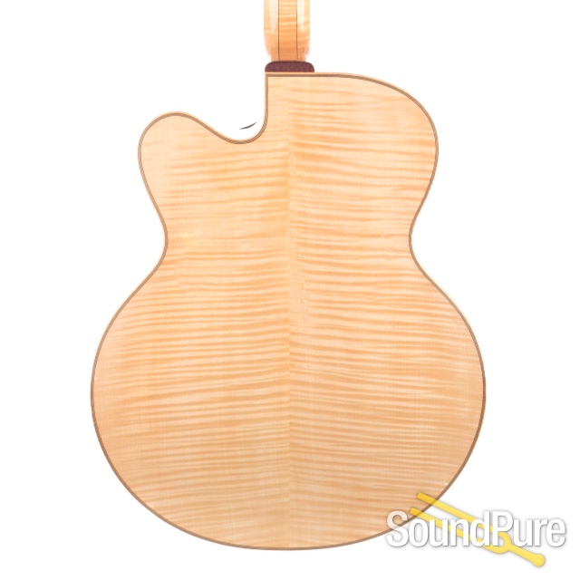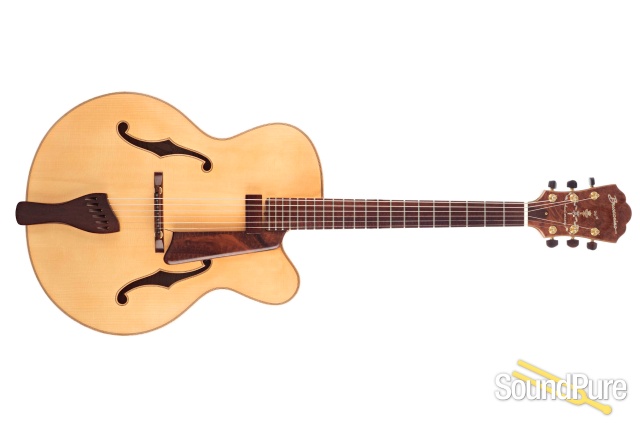 A 17″ archtop with a 25″ scale and 1-3/4″ nut, this guitar is a wonderful mix of L-5 orchestra-guitar volume and ES-175 playability. Acoustically, it can chunk out all the Freddie Green you’d care to comp, or translate every Mixolydian flat-13 nuance that a fingerstyle jazzer could imply. Plugged in, the dual-source pickup system lets you shape your amplified tone either way. The slim neck fits the hand like a kidskin driving glove, the fretwork is impeccable, and the action is super consistent up and down the neck. Simply put, there is absolutely nothing standing between you and effortless musical expression.