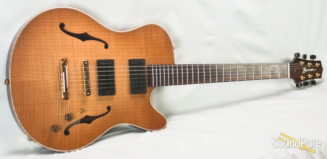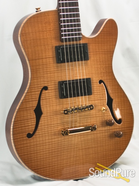 Breathtaking! This a "working" work of art! Unamplified, the strength and character of tone grabs you right away. Plug 'er in and start experimenting with the selector switch and coil splitting push/pull toggle on the bocote knobs and the guitar comes to life or, rather, lives--so many sophisticated and complex voicings can be coaxed out of this thing! The handcarved 5A Private Stock maple top is incredibly precise and responsive to a huge variety of approaches while the sapele body rounds and warms the tone, lending a subtle, natural reverb to everything you play. The 1 23/32" nut width accomodates complex chordal arrangements though the neck is certainly swift enough to keep your fretting hand steady but never stuck. What can't you play on this thing?! Every note bespeaks quality without a trace of bias toward a particular genre. Self-expression is always the goal when you pick up a guitar but it's rare to pick up an instrument that palpably works with you to achieve that goal. Call us up and get this beauty on your doorstep today!
