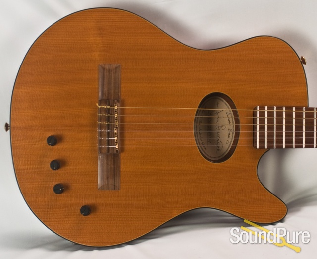 The Starlight Nylon is a Thin Body Electric Acoustic Classical Guitar. Starting with a one piece body of Swamp Ash or Honduras Mahogany a sound chamber is created by hollowing out the inside of the body. The sound chamber helps produce some acoustic tone unplugged which allows the player to hear the guitar in practice situations or other settings where plugging in is undesirable and adds a more natural tone when plugged in. The Top is braced using a Lattice bracing pattern which helps to strengthen the top and give a little more punch to the acoustic tone. The bolt on neck with our exclusive DeadBolt Neck Joint Design gives you that neck thru body feel with the convenience of a bolt on neck. The heel is rounded and smooth making the guitar more comfortable to play and gives easier access to the upper frets. The DeadBolt Neck Joint adds superior strength to the Neck and increased sustain to your tone.