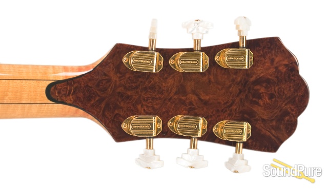 The Virtuoso headstock exotic burl wood faceplate is adorned with an ornate inlay with a unique mother-of-pearl banner inscribed with "Virtuoso". Burled wood veneers on the back of the headstock and heel cap complete the exotic motif. Comes standard with full binding and intricately mitered perflings. On the wood bound model, the Burl veneer is laminated to veneers of maple and ebony and beveled to create the pinstripe effect.