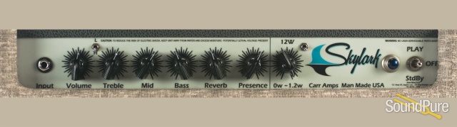 Reverb, a built in power attenuator, Hi/Low gain switch, and the extended range presence control offer an incredible pallet of tones from the Skylark’s beautiful dove-tailed cabinet.