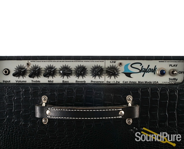 Reverb, a built in power attenuator, Hi/Low gain switch, and the extended range presence control offer an incredible pallet of tones from the Skylark’s beautiful dove-tailed cabinet.