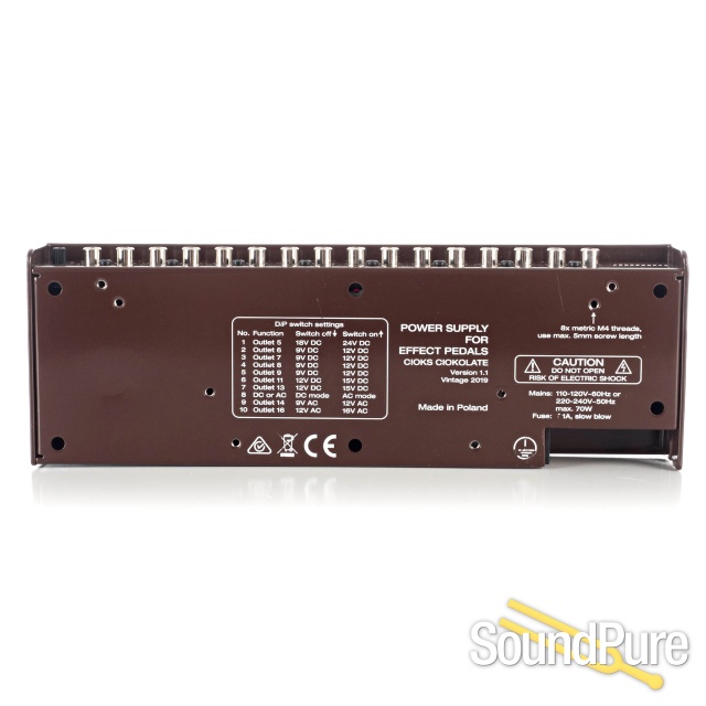 CIOKS CIOKOLATE power supply will power several high current digital pedals, high voltage 18, 24 or even 40V pedals, one or two AC pedals, one or two Radial Tonebone pedals or simulating a dying battery it will power your old favourite fuzz or overdrive. On top of all that it will of course also power all your standard 9V pedals from its many isolated outlets.