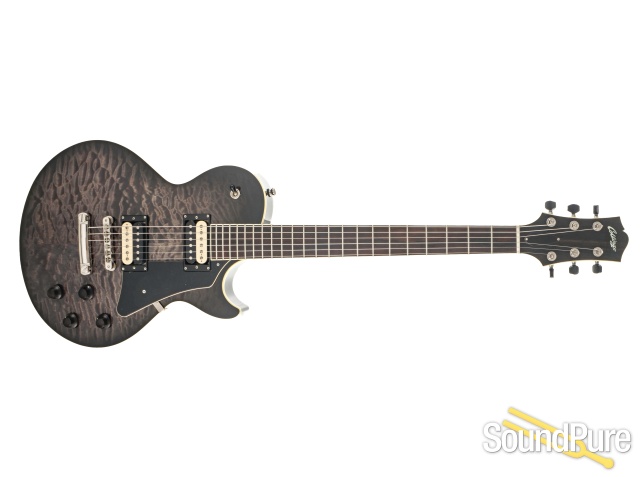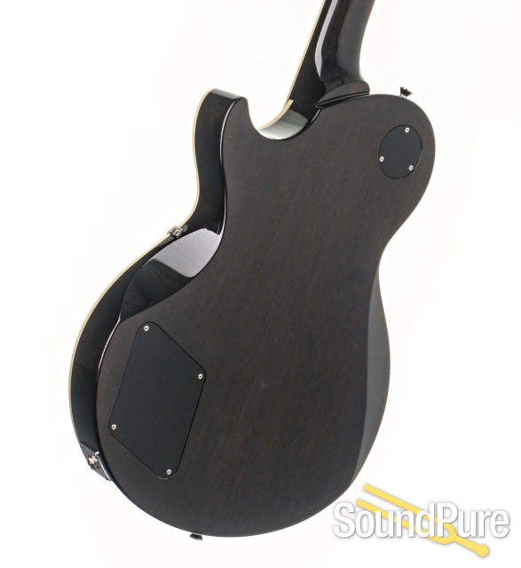 The darkness of the Acid Wash Charcoal Burst finish, ebony peghead veneer and inlay-free Ziricote fingerboard is perfectly silhouetted by the ivoroid binding on the body, neck, and peghead of this custom CL Deluxe. A pair of Lollar Imperial humbuckers in optional zebra attire are fitted precisely into the black 3-ply pickguard, perfectly complementing its stark, contrasting theme.