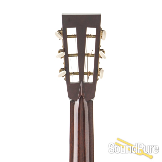 Our 2-style (Parlor 2H T) features East Indian rosewood back and sides with ivoroid body binding and butt wedge, small brown herringbone top purfling, a “zipper” backstrip, diamonds and squares fingerboard inlays, and a more intricate 2-style rosette