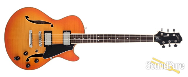 The GCS-1 is a solidly built semi-hollow guitar designed for musicians looking for a well-made practical and roadworthy musical instrument. Inherently versatile, it can produce a myriad of tonalities suitable for blues, rock, country, and jazz playing. It adorns a laminated flame Maple top with a laminated Sapele back, and the sides/internal block structure are routed from a solid wood core. This design yields a balanced and even articulation with enhanced sustain characteristics. Included is a TKL hardshell case. A version with a U.S. made Bigsby vibrato is also available.