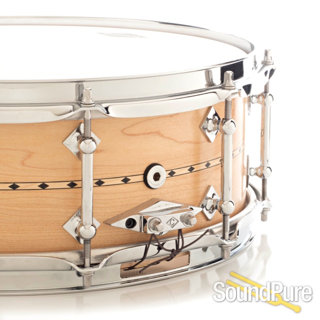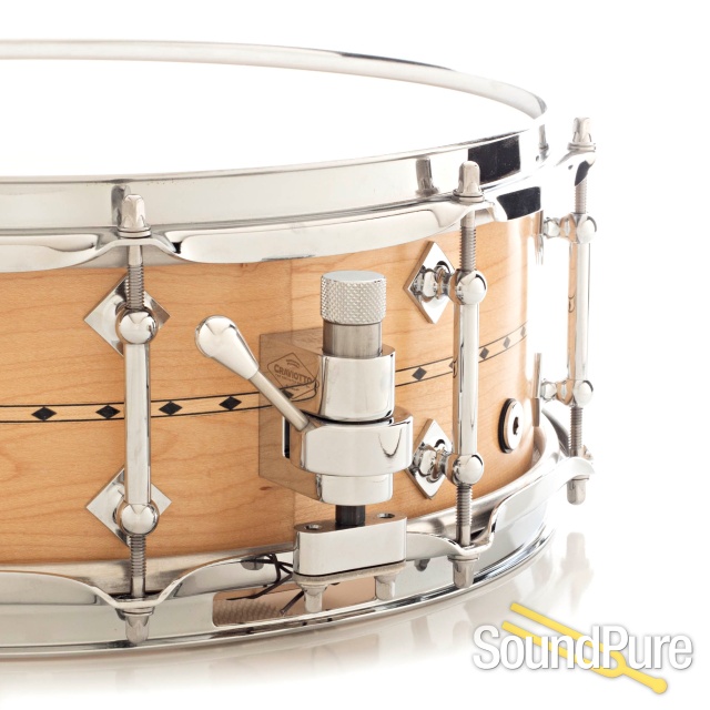 This Craviotto Custom Maple snare drum has amazing looks and sound. The maple delivers excellent attack and quick decay. Outfitted with 45-degree bearing edges, this snare has great definition in multiple tuning ranges. The finish is simple and elegant, allowing the inlay and natural grain of the curly maple shell with matching reinforcing rings to reveal themselves. The classic tube lugs tune easily and hold tune easily as well. It also is equipped with the Trick throw-off, which has really become the industry standard for custom companies.