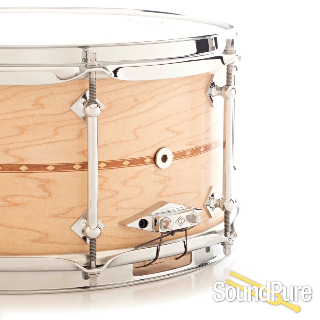 The Custom Shop Snare Drums are the flagship drums of the Craviotto Drum Company, and consist of high performance, highly collectible Solid Shell snare drums. Available in Ash, Maple, Cherry, Poplar, Walnut or Mahogany (or any Stacked Solid combination thereof), with an optional Maple, Cherry or Walnut inlay, each Custom Shop Snare Drum features a hand-selected, handcrafted shell and gleaming chrome-plated hardware along with premium-quality components including Craviotto’s chrome over brass machined “Diamond” tube lugs, Aquarian drumheads and Craviotto Deluxe Snare Wires. All drums come with a chrome Trick GS007 strainer. Options include a choice of heavy-gauge (2.3mm) triple-flanged Vintage style straight or diecast counterhoops and natural satin oil or high-gloss lacquer finish.