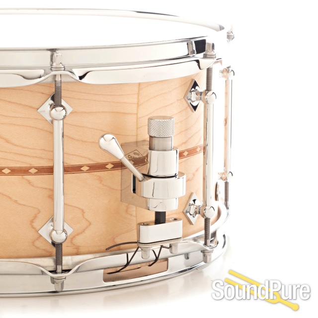 This Craviotto Custom Maple snare drum delivers excellent attack and quick decay in an un-assuming package. Outfitted with 45-degree bearing edges, this snare has great definition in multiple tuning ranges. The finish is simple and elegant, allowing the inlay and natural grain of the maple shell with matching reinforcing rings to reveal themselves. The classic tube lugs tune easily and hold tune easily as well. It also is equipped with the Trick throw-off, which has really become the industry standard for custom companies. Since their inception, Craviotto drums have been considered some of the most sought-after instruments in the world. It is their craftsmanship and commitment to quality that has set their work apart from all of the rest. Once you hit one of these incredible drums, you'll see why it's no wonder so many players go to Craviotto to find their sound.