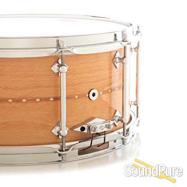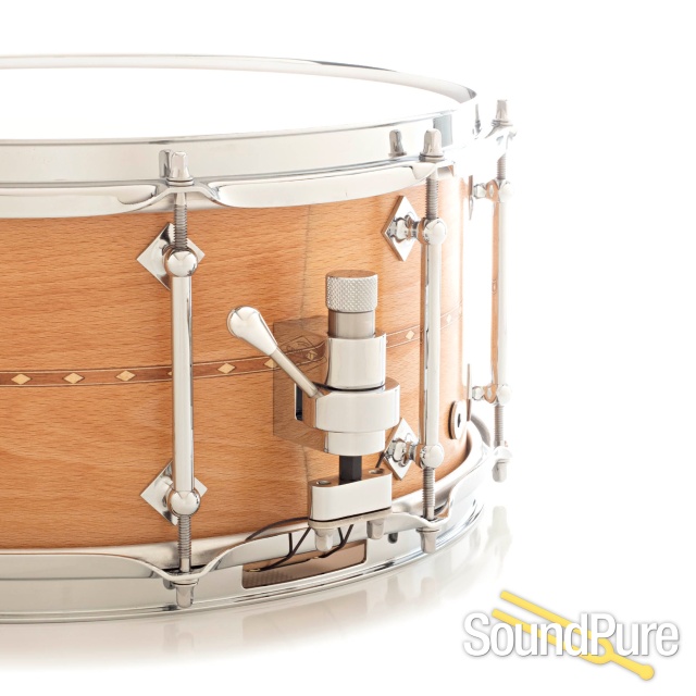 This Craviotto Custom Beech snare drum delivers excellent attack and quick decay in an un-assuming package. Outfitted with baseball bat bearing edges, this snare has great body in multiple tuning ranges. The finish is simple and elegant, allowing the inlay and natural grain of the beech shell with maple reinforcing rings to reveal themselves. The classic tube lugs tune easily and hold tune easily as well. It also is equipped with the Trick throw-off, which has really become the industry standard for custom companies. Since their inception, Craviotto drums have been considered some of the most sought-after instruments in the world. It is their craftsmanship and commitment to quality that has set their work apart from all of the rest. Once you hit one of these incredible drums, you'll see why it's no wonder so many players go to Craviotto to find their sound.