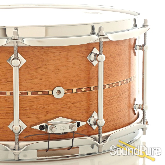 Craviotto snares have long been regarded for their tone and aesthetics. This 6.5x14 Mahogany snare with inlay is no exception. Light to the touch, it delivers big solid tone in a small package. The 30-degree bearing edges create articulate and defined sounds in multiple tuning ranges while the shell adds warmth you won't get from its maple or birch cousins. Mahogany snare drums have a distinctively dark, earthy tonal quality derived from the more porous, less dense wood that naturally filters the snare's high frequencies. The maple reinforcing rings are used as a way to help counterbalance the Mahogany's prominent lower overtones by stabilizing the shell, raising the pitch and increasing its projection without sacrificing its unique tonal tendencies. Once you hit one of these incredible drums, you'll see why it's no wonder so many players go to Craviotto to find their sound.