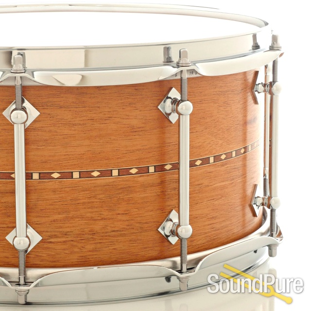 The warmth of mahogany in a beautiful package. 6.5x14 Craviotto Mahogany Snare Drum with Centered Inlay. 30-degree bearing edges.