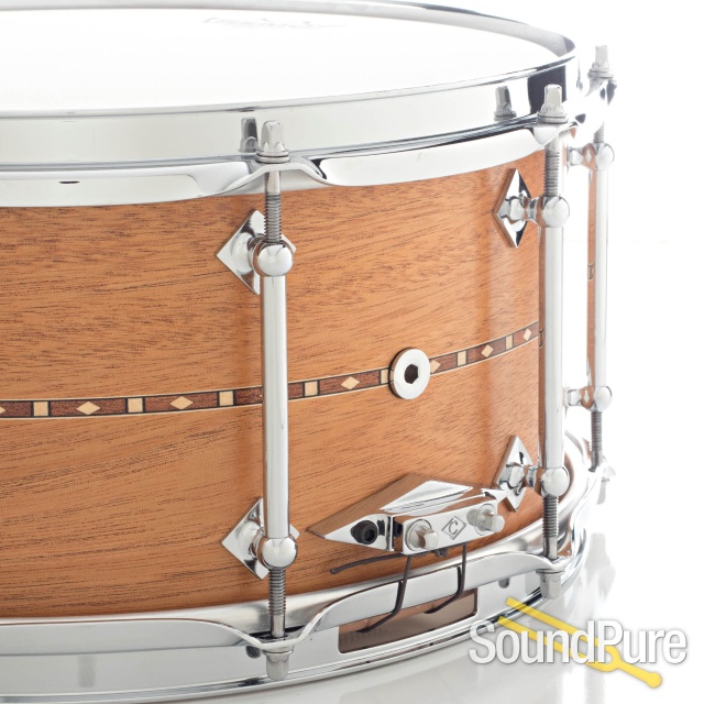 This Craviotto custom mahogany snare drum is simple and warm. Mahogany snare drums have a distinctively dark, earthy tonal quality derived from the more porous, less dense wood that naturally filters the snare's high frequencies. The maple reinforcing rings are used as a way to help counterbalance the Mahogany's prominent lower overtones by stabilizing the shell, raising the pitch and increasing its projection without sacrificing its unique tonal tendencies. The classic tube lugs tune easily and hold tune easily as well. It also is equipped with the Trick throw-off, which has really become the industry standard for custom companies. The baseball bat bearing edges offer a smoother sound than it's contemporary cousins with 45-degree bearing edges.