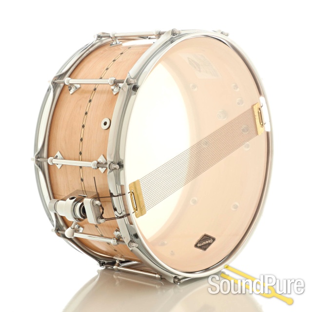 This Craviotto Custom Maple snare drum delivers excellent attack and quick decay in an un-assuming package. Outfitted with 45-degree bearing edges, this snare has great definition in multiple tuning ranges. The finish is simple and elegant, allowing the inlay and natural grain of the maple shell with matching reinforcing rings to reveal themselves. The classic tube lugs tune easily and hold tune easily as well. It also is equipped with the Trick throw-off, which has really become the industry standard for custom companies. Since their inception, Craviotto drums have been considered some of the most sought-after instruments in the world. It is their craftsmanship and commitment to quality that has set their work apart from all of the rest. Once you hit one of these incredible drums, you'll see why it's no wonder so many players go to Craviotto to find their sound.